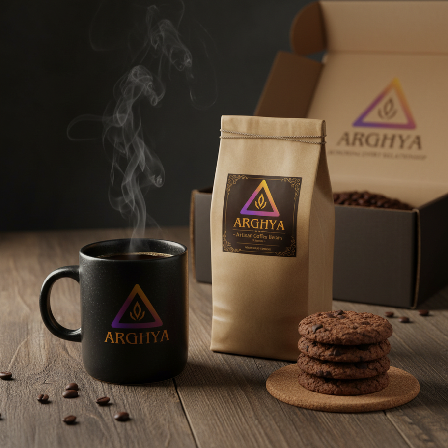 Branding: Arghya logo printed on the coffee pouch label, mug, and cookie pack sticker. A branded "Brew & Pause" sleeve wraps the box.