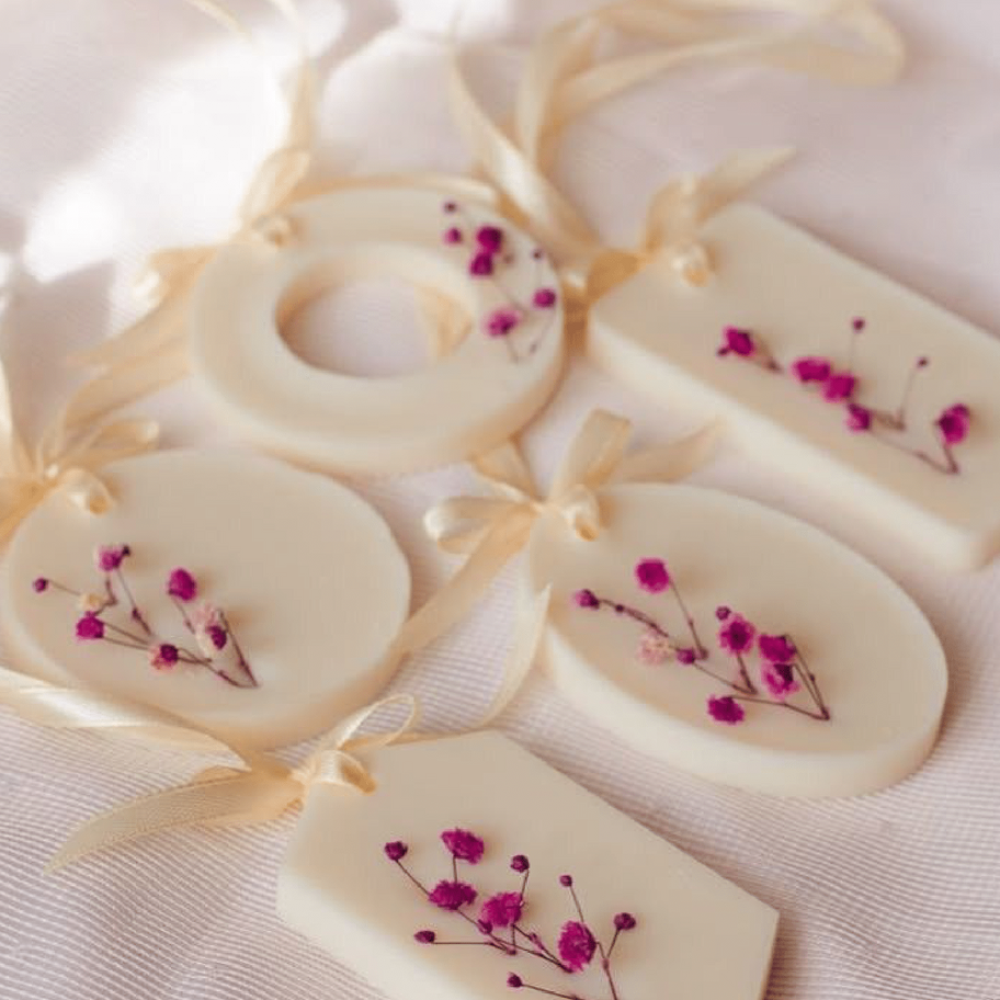 A decorative soy wax block infused with essential oils and dried botanicals, shaped for hanging or placement in enclosed spaces to provide long-lasting room fragrance without flame.